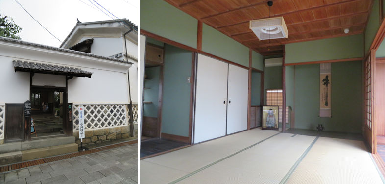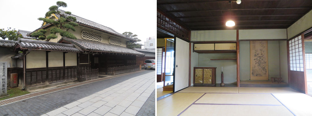 The outside of the Matsuzaka residence facing high street (left) and the spacious reception room where guests would have been received (right).