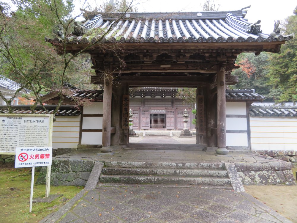 Buttsuuji Temple was founded by the Kobayakawa Family by inviting a zen high priest from China at the end of the 14th century. It flourished under the patronage of the Kobayakawa as well as Mouri Families. It went into decline in the Edo era but regained prominence from the Meiji era. It is the largest zen meditation dojo in western Japan and offers group training for company employees. The serene and solemn setting certainly is ideal for a zen temple. It was a couple of minutes’ walk through the woods to reach the sanmon entry gate. It was apparent that the flooding in July had caused some damage to the river banks flowing through. We went through the sanmon gate to reach the main temple area. I understand the current gate was constructed at the end of the 18th century. There was a description by the gate that tells us the history of Buttsuuji.