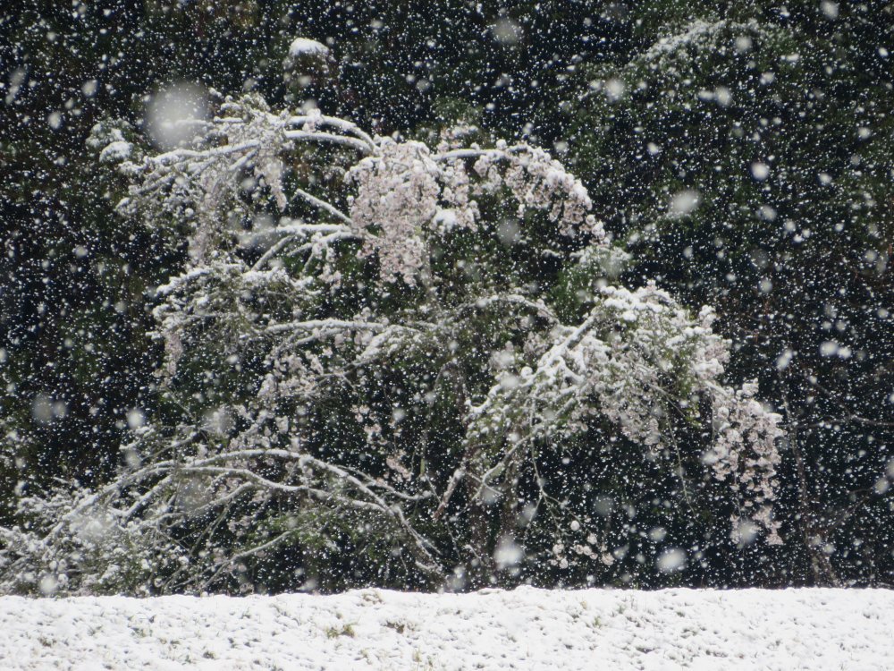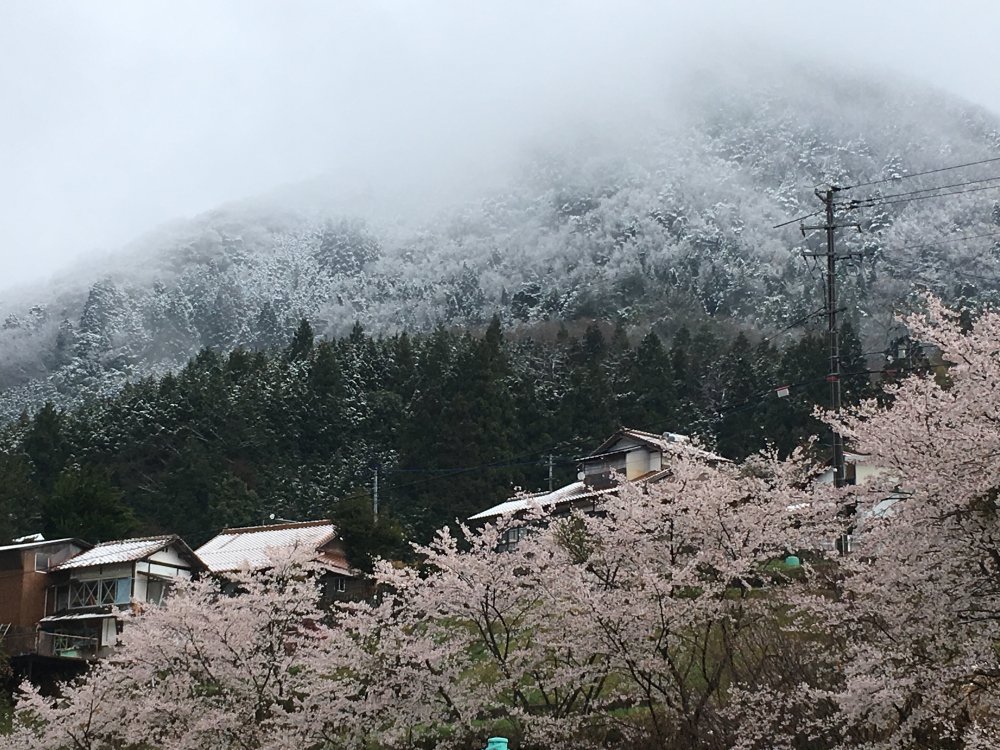 It was still snowing from time to time as we climbed down the Chugoku Mountains. In the lower altitude area the cherry blooms in full bloom appeared to be freezing in the snow.