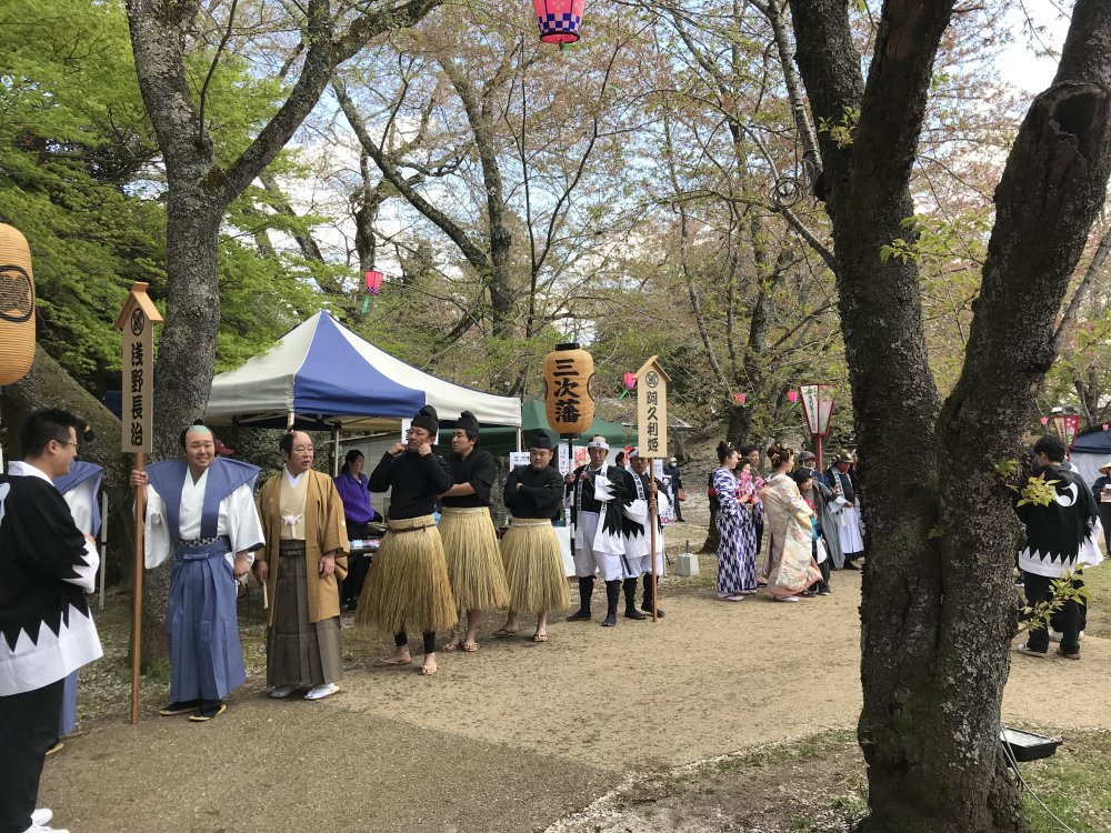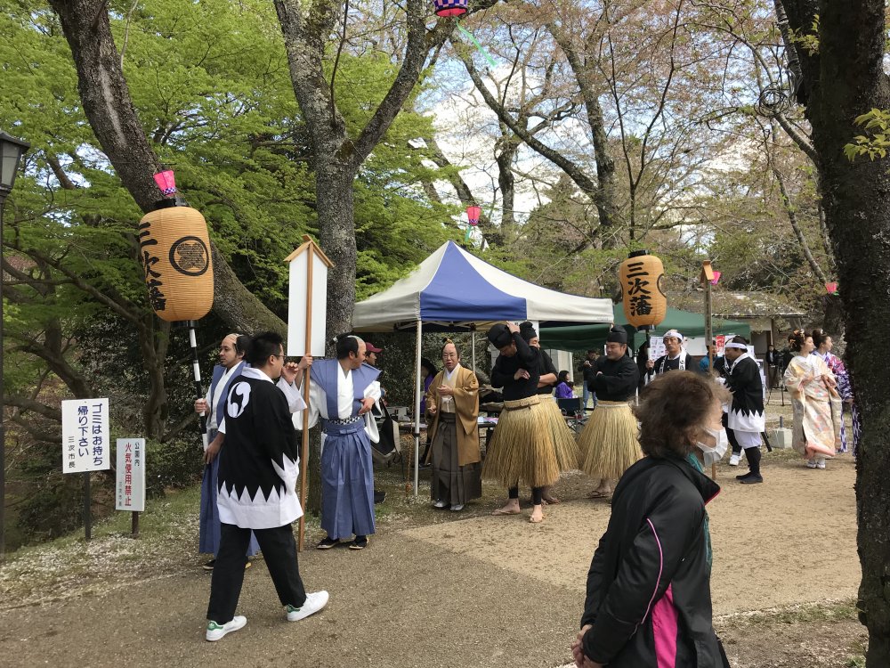 The Sakura Festival was being held the day we visited Miyoshi City. The event was at Ozekiyama Park where Ozekiyama Castle once stood on a hilltop. Ozekiyama was named after MasakatsuOzeki, a subordinate of Masanori Fukushima that resided in the castle. In the Miyoshi sub feudal domain period the castle served as a second residence for the Miyoshi Asano family. A costume parade was just about to start. The star was Princess Aguri. She was the tragic princess of the Miyoshi Asano family that married Takuminokami Asano, the feudal lord of Akou feudal domain in Hyogo Prefecture. Her husband attacked Kouzukenosuke Kira, another feudal lord in Edo Castle in 1701. Takuminokami Asano was ordered to kill himself on the day and the Akou feudal domain was discontinued. Forty seven samurais angry at the harsh treatment, revenged by assassinating Kouzukenosuke Kira, after which they were sentenced to commit suicide.This became the famous kabuki theme KanatehonChuusingura. Princess Aguri became a Buddhist nun and was taken care of at the Edo residence of the Miyoshi Asano Family.