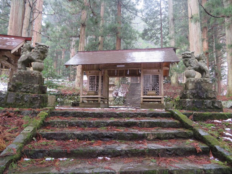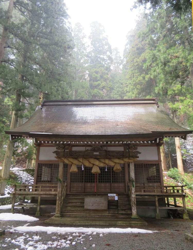 The northern area of Taishakukyou is part of Tojo (east castle) Town in Shoubara City. There is a Saijo (west castle) Town about thirty kilometers west also in Shoubara City. I understand that these castles that no longer exist were the defense castles of a pre -Edo era feudal lord, the Miyoshi Family. The last place to visit was Kumano Shinto Shrine in Saijo Town. This Shrine that worships Goddess Izanami was founded here as a praying spot to Goddess Izanami’s burial place in Mount Hiba (according to one of Japan’s oldest chronicles Kojiki composed in the 8th century) further up in the Chugoku Mountains. We went up the steps to come to a plateau surrounded by huge pine trees that must be several hundred years old at least. The path leading further up reminded me of the pilgrimage routes in the Kii Mountains.