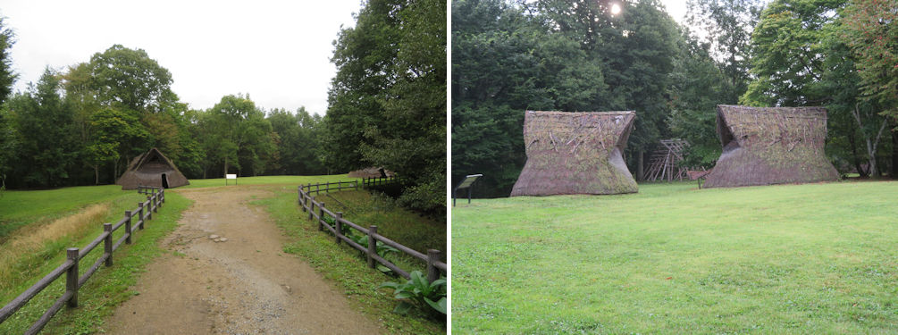 The path from the museum leading to the reconstructed Jomon settlement (left). Two reconstructed Jomon dwellings (right).