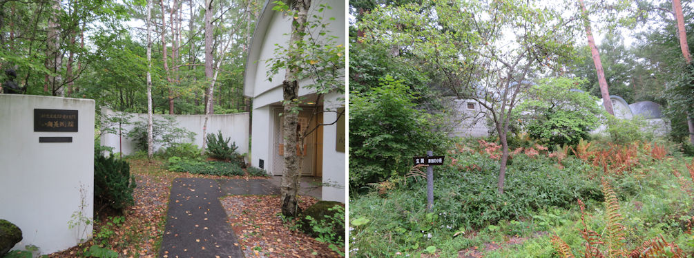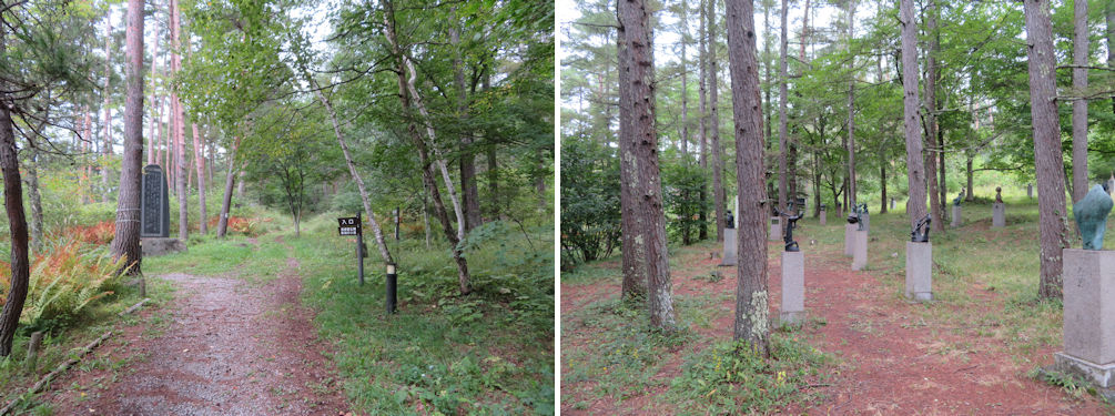 The path through the forest to the museum (left). The sculpture work of local junior high school students along the path (right).
