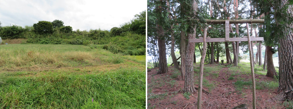 I finally located the site area with the help of a map I found in a 1998 excavation report of the site. There are no signs whatever of the site, and the area has been restored to its original state of fields and bushes (left). There was a Shinto shrine named Kasiwade Jinja in a small forest on the north side of the site. Perhaps this area was surrounded by forestry in the Jomon days (right).