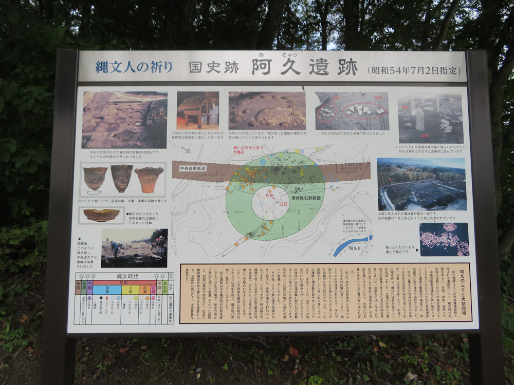 From there I drove to the Akyuu site not that far from the Maeone site. This is a much older site dating back to 4500 B.C. not much later from when the Jomon people first settled in this area, continuing to the Heian period (8th to 12th century A.D.). The site was excavated in the late 1970s upon the construction of the Chuo Expressway and then buried and preserved in its original state. The Chuo Expressway passes through the center of the site. Rock pillars and large stones were installed in the center area which is believed to have been a special ritual and burial site. I had learned beforehand that the site had been buried and there would not be much to see, but thought it worthwhile to at least take a look. The site was easier to find as it appeared on maps and there were signs leading to the place. The area is in a forest and there was a sign at the edge of the forest with explanation of the site.