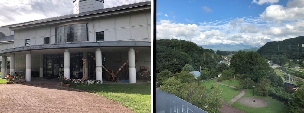 The Yatsugatake General Museum not far from the city center of Chino (left). You can go up the stairs to reach the rooftop from where you can command a spectacular view of Chino and the surrounding mountains (right).