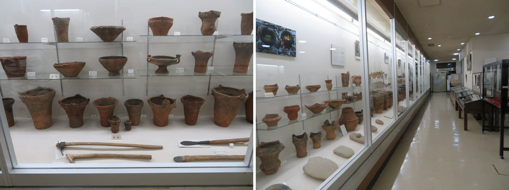 Display of various pottery from around 2500 to 2000 B.C. and farming tools (left) and a view of the inside of the museum (right).