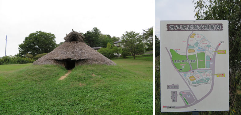 We went the path downhill to an open area with a resurrected Jomon dwelling(left). Map of Idojiri Historic Site Park (right). The two museums are on the bottom left and the Jomon dwelling is marked by a black dot.