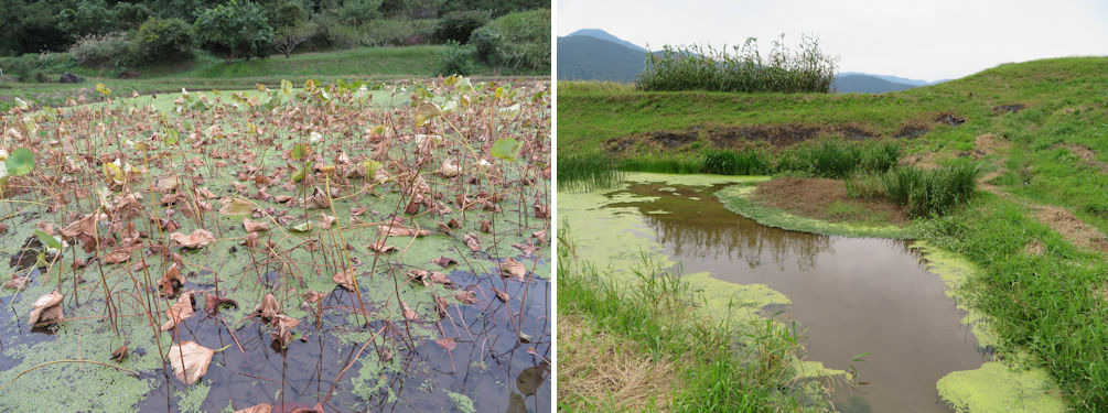 The flowering season was over and the Oga Lotus leaves had started to wither(left). There were some beds for kakitsubata, a nowadays rare native Japanese iris, but again the flowering period was back in June/July time.