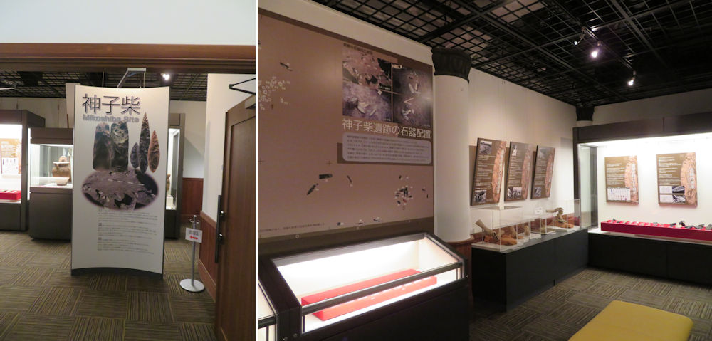 A banner welcomed us into the display room. The number of the objects are not large, but even from the eyes of an amateur, the perfection and quality standards were quite obvious. The variety is also diverse, with flaked axes, partly-polished flaked axes, points, scrapers, hones and so on. This has led some to believe that Mikoshiba was a depot site of stone tools. The majority of the used material is obsidian from the Suwa area.