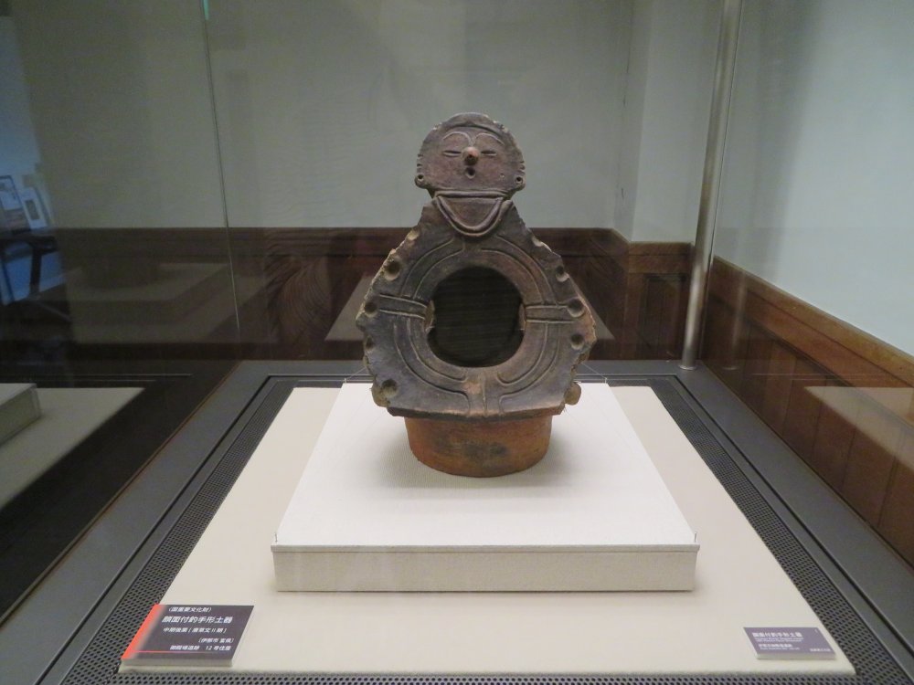 Also on display was an earthenware with a faced carrying handle. This was dated back to 2700 B.C., the peak of the Jomon culture in the Yatsugatake area, represented by sites such as Idojiri in Fujimi Town. This particular object was excavated from the remains of a Jomon dwelling at the Gotenba site, also in Ina City.