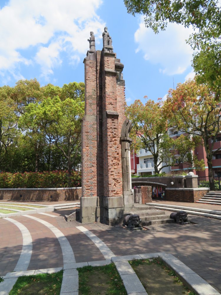 We then walked about ten minutes to the hypocenter which is a park further east to Peace Park. A monument has been erected at the hypocenter. Close by is the remnant of the ruined walls of Urakami Cathedral relocated to this site when the cathedral was reconstructed.