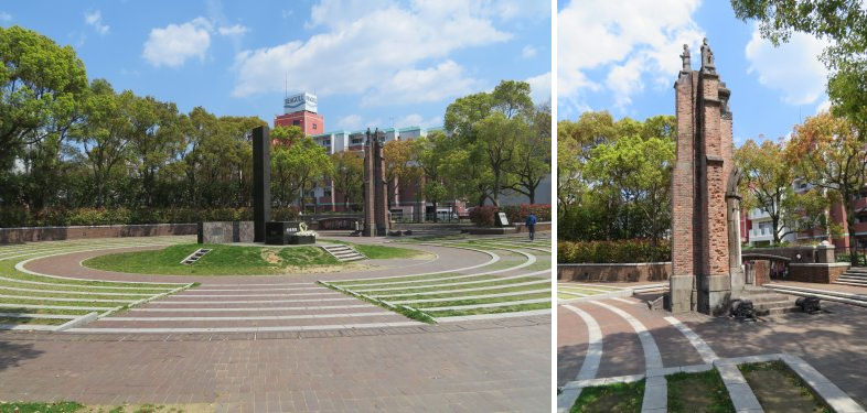The hypocenter monument (left) and the remnant of the ruined walls of Urakami Cathedral relocated to this site when the cathedral was reconstructed (right).