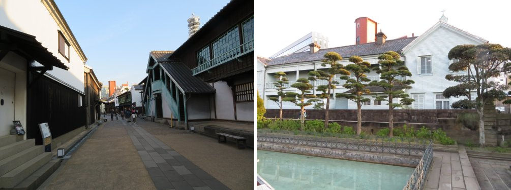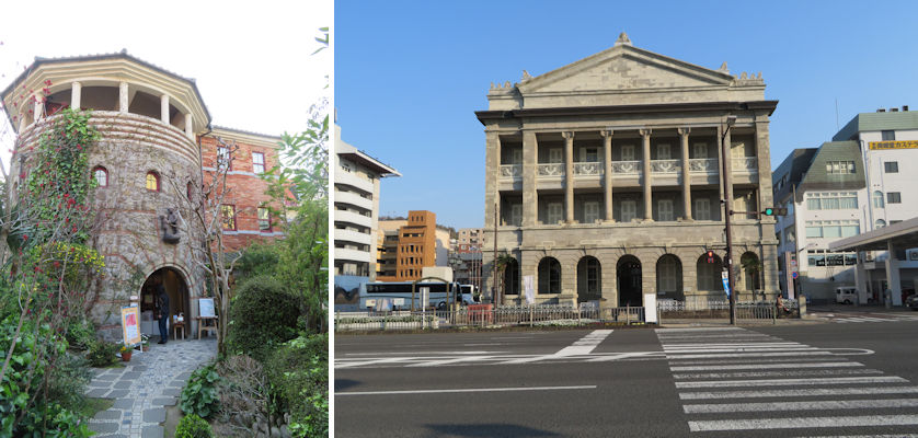 The pretty Western style building of Inori-no-oka Picture Book Museum on Glover Street (left) and the grand former Hong Kong Shanghai Bank’s Nagasaki Branch.