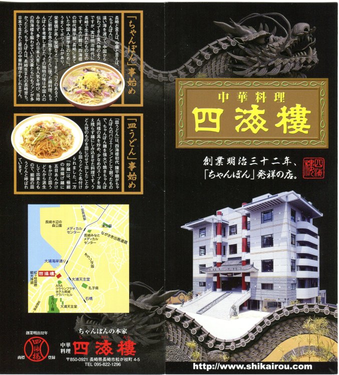 The pamphlet of Shikairou that invented two Nagasaki dishes, champon and saraudon. We tried both. The total bill including a beer was 3,240 yen..