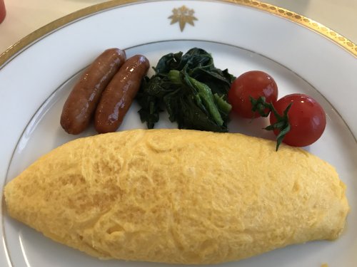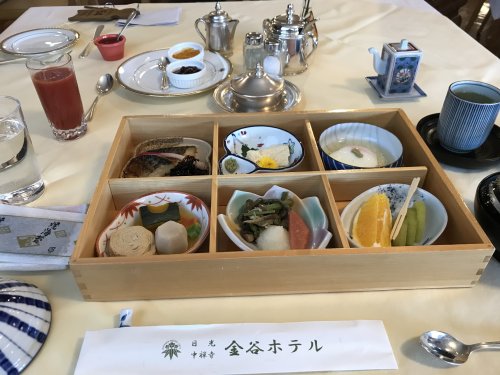 Breakfast at Kanaya Hotel. You have a choice of Japanese bentou box (left) and their famed omelette (right).