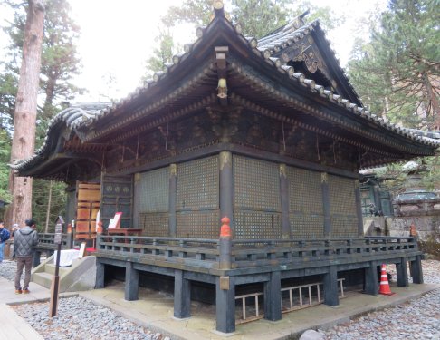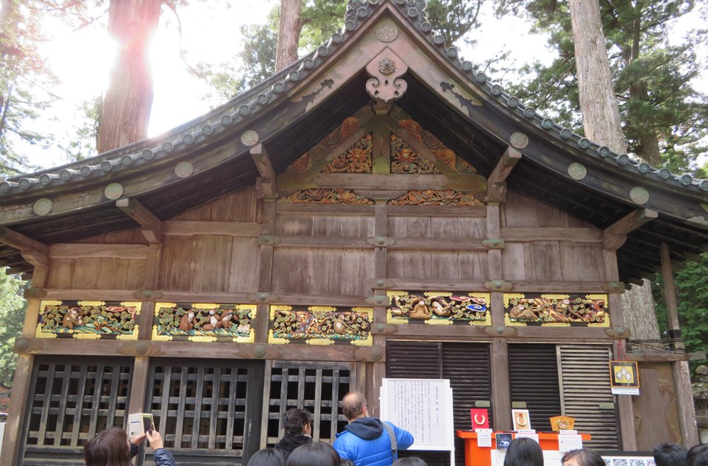 We turned left to view the three monkeys called don’t see (mizaru), don’t hear (kikazaru) and don’t say (iwazaru) in the Shinkyuusha (stable for two sacred live horses for the deity to mount). There was quite a large crowd in front of the Shinkyuusha