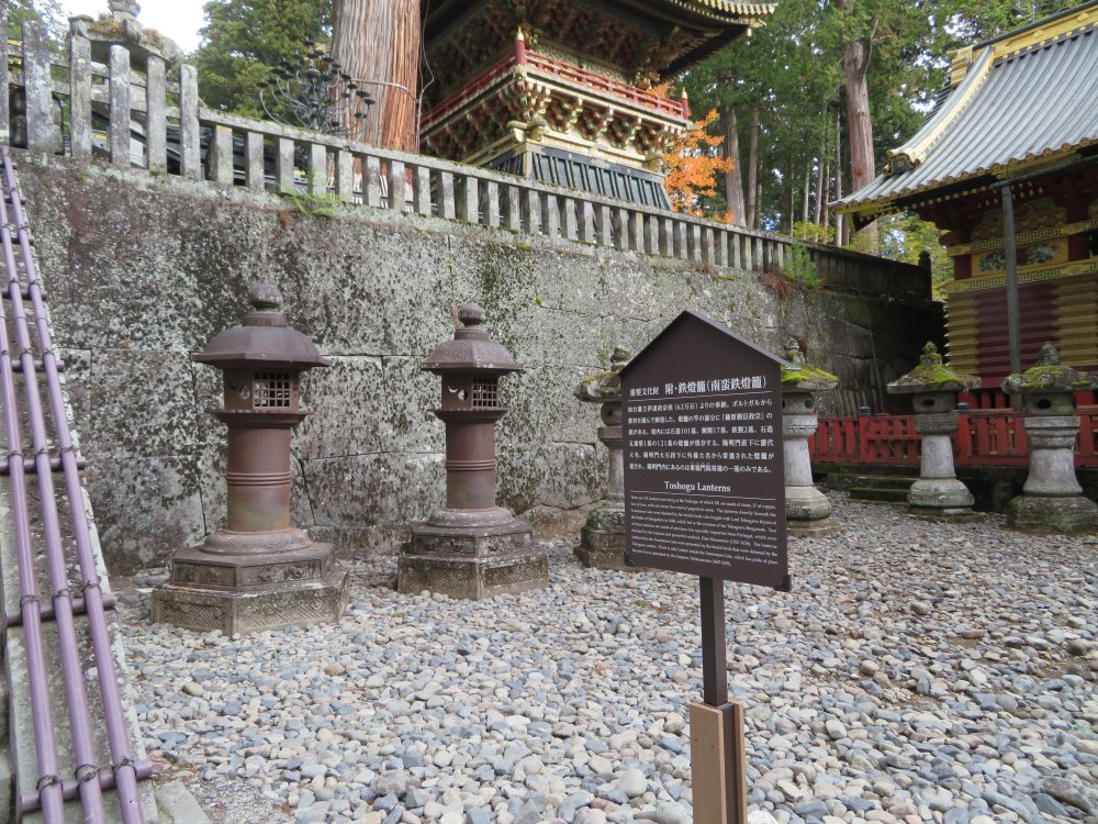 The two steel lanterns contributed by the feudal lord of Sendai feudal domain.