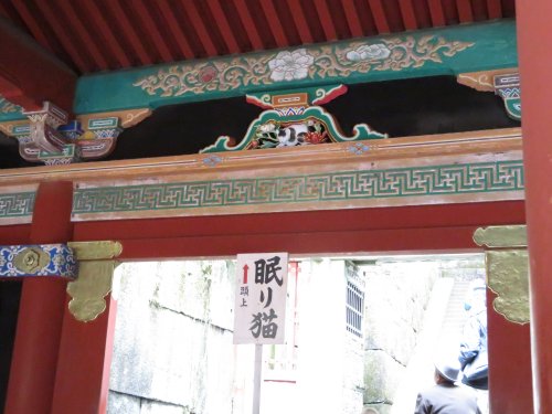 Before visiting the main shrine, we went to the right past the Kaguraden and Kitouden to see the Nemurineko (sleeping cat). This is a sculpture of a cat sleeping peacefully said to be by Jingorou Higashi, a master sculptor. The Nemurineko is on the gateway to Ieyasu’s grave in the back mountain. Don’t forget to turn around to see the other side of the Nemurineko with two sparrows. Some say that sparrows and the cat side by side depicts a wish for peace. Others say that the cat is protecting Ieyasu’s grave and is ready to pounce on invaders.