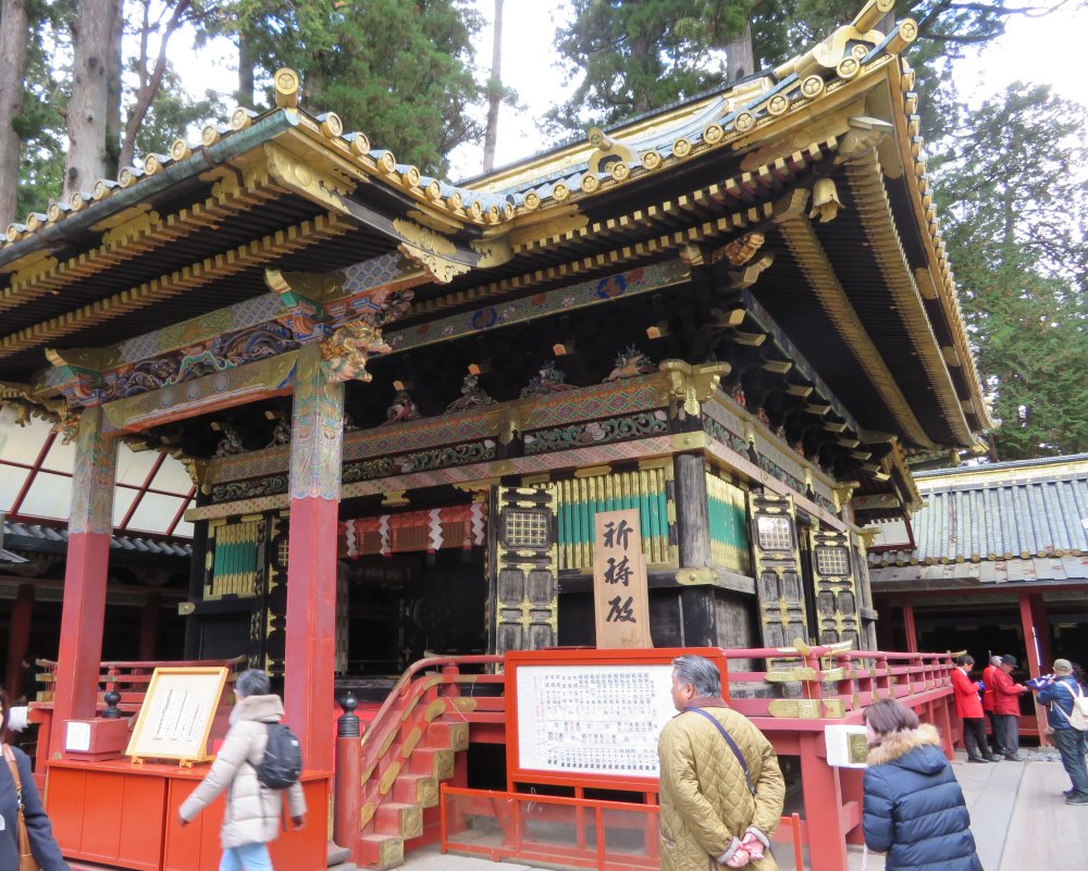 There was quite a large crowd in front of the Shinkyuusha. The famous three monkeys are on the second frame from the left.