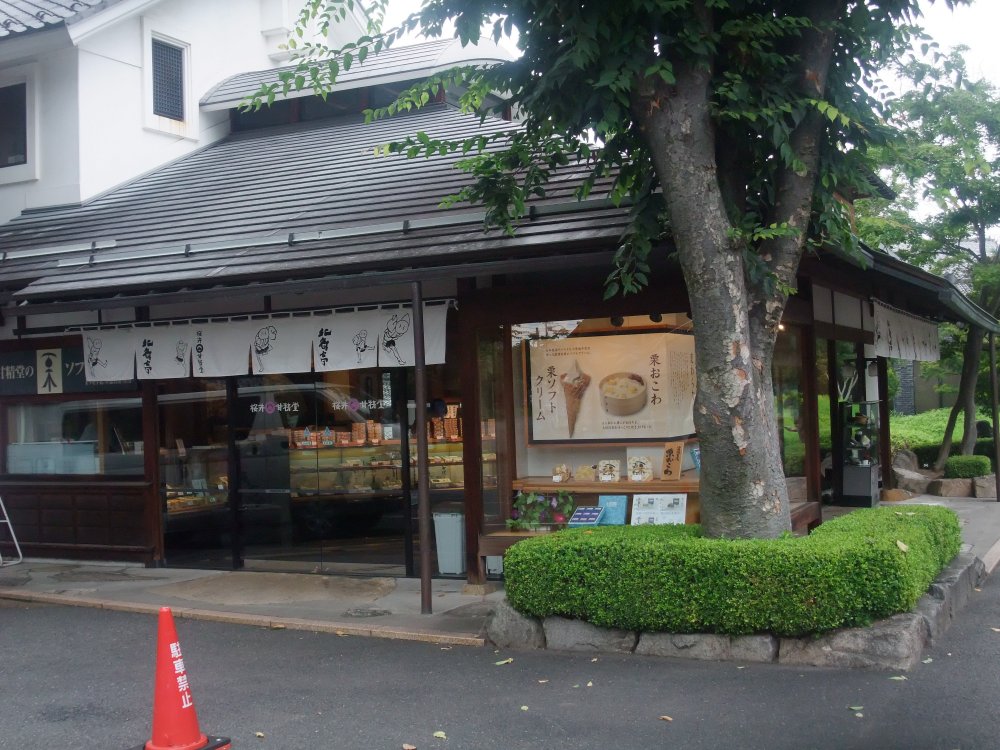 Our final destination was Obuse, about 25 kilometers nor th east and 10 kilometers east of Nagano city. We wished to visit Obuse as this was another area called Little Kyoto It is also famous for its sweet chestnuts and its relation with Hokusai. Hokusai lived 4 years in Obuse. Hokusai left a particularly striking roof art in a Soutou Zen sect temple Ganshouin. It was very warm that day. We parked our car in a car park off the high street. We went up the famous KURI NO KOMITI (chestnut path) for a couple of minutes that led us up to a plaza surrounded by famous chestnut sweet shops. It was a warm day, and my wife enjoyed a KAKIGOORI with chestnut flavor. KAKIGOORI is thinly chopped ice in a bowl with a topping of syrup, typically melon, lemon or strawberry. In most cases, the syrup is artificial color and flavor. Here the chestnut flavor was genuine. We bought some delightful chestnut WAGASHI at the shop.