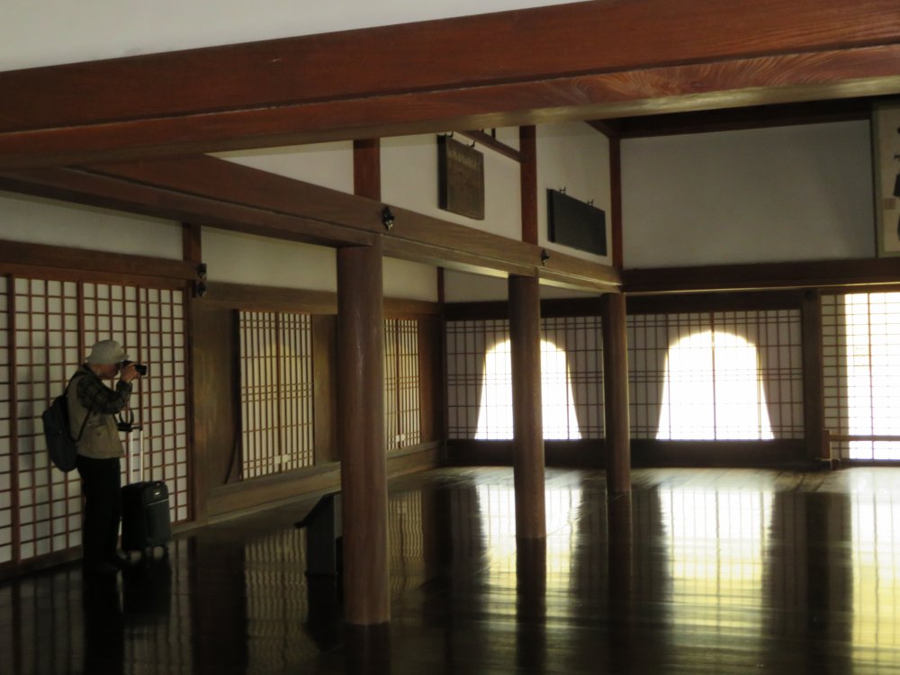 The interior of the grand hall in the koudou building built in 1701 and designated a National Treasure. You are not allowed to enter the hall. It is a pity that some people just ignore the rules. This tourist had even brought his suitcase and placed it on the wooden floor!.