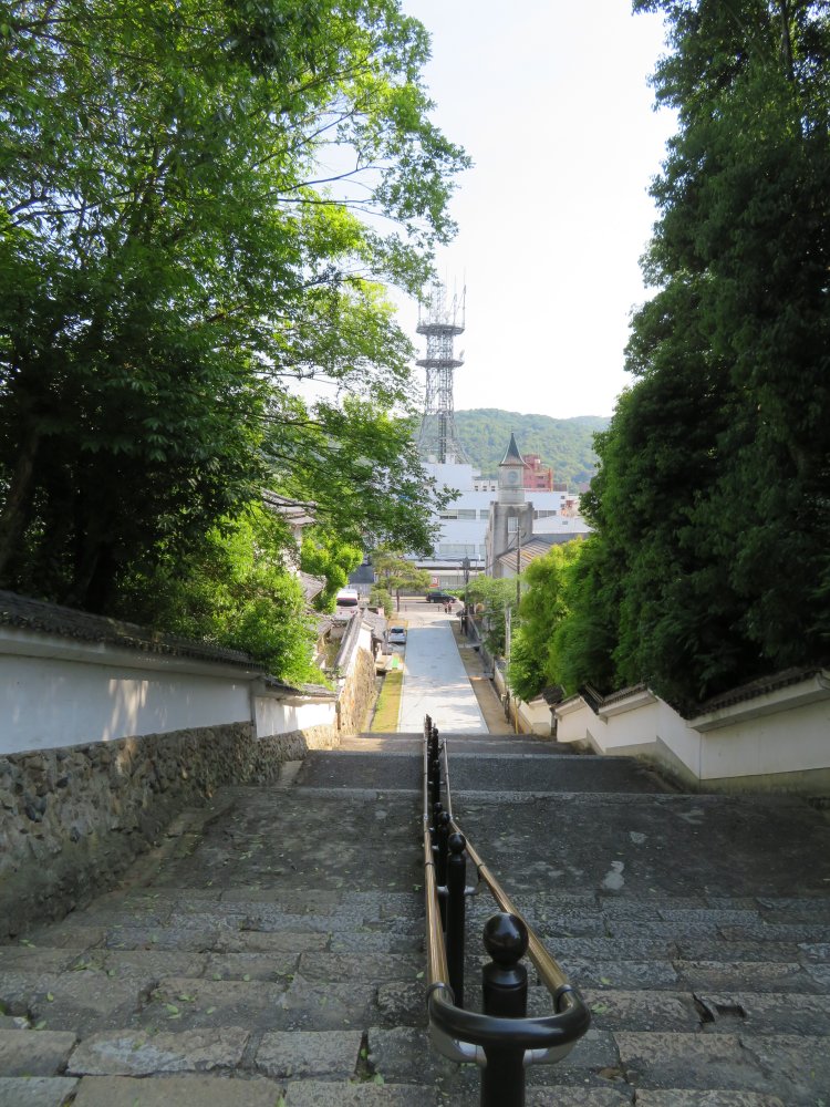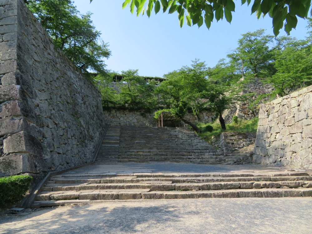 We paid the admission fee of 300 yen and entered the castle grounds. The castle which at its peak, boasted having seventy buildings was one of the most magnificent in feudal Japan. We subsequently learned through a video aired in a castle building that this was because historically the land had many local samurai lords to which the Mori Family had to demonstrate his power and presence. All the castle buildings were dismantled by 1875, and since 1900 has been a municipal park of Tsuyama City. One building, Bicchuu Yagura has been reconstructed in 2005. We were recommended at the admission office to first go up to the main castle area (honmaru) and visit the Bicchuu Yagura, then the castle keep site and from there the north western route back to the castle entrance. We went up the wide stone steps that zig-zagged to reach the vast honmaru area.