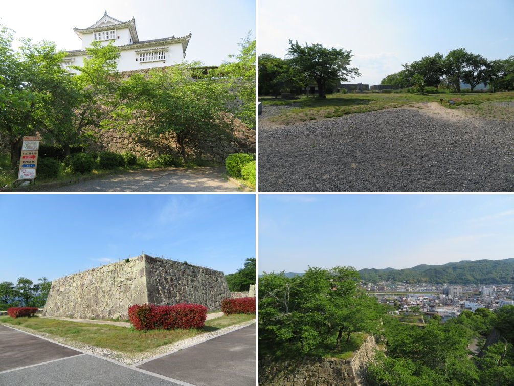 The Bicchuu Yagura (upper left), the vast main castle area (upper right), the stone foundation of the castle keep (lower left) and view of the city from the keep area (lower right).