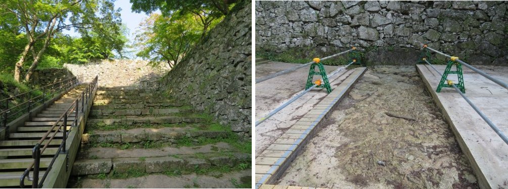 On our way back via the northwestern route, we noticed some ongoing excavation work. We had seen similar efforts at Takeda Jinja (formerly Tsutsujigatani Castle) in Koufu City. While I hope such efforts will lead to further discoveries, I couldn’t help but notice the deterioration of the grand castle stone foundation, which I understand is a common challenge for the preservation of Japanese castles.