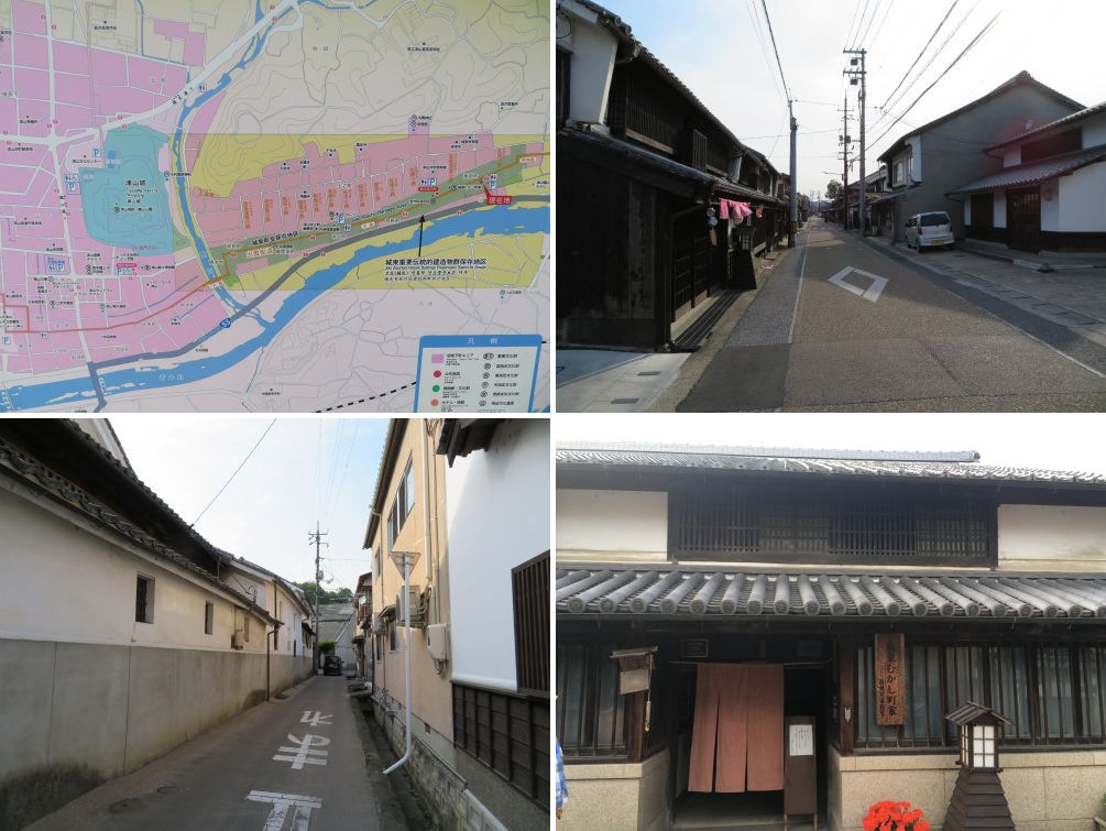 Map of the designated area found at the visitors' car park (upper left), view of row of merchant buildings looking west on the Izumo Kaidou route (upper right), looking north in one of the side alleys (lower left) and the Mukashi Machiya open to the public.