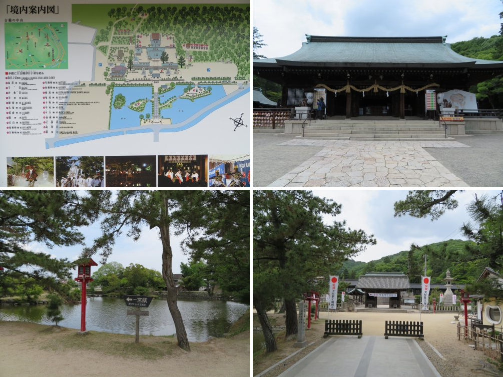 The lake in front of Kibitsu-jinja (upper left), the temple grounds (upper right) and the grand sanmon gate apparently under repair (lower left) The sign by the gate was barely discernible (lower right).