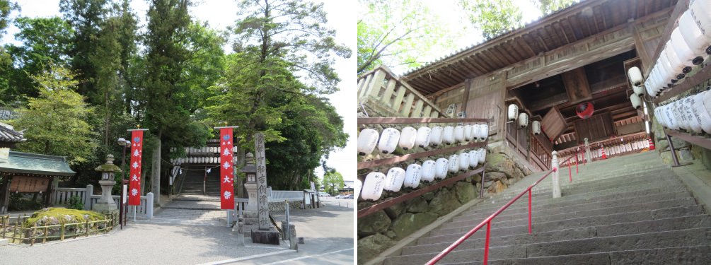 From there we went to our next and last destination Kibitsu-jinja Shinto shrine in Okayama City between Okayama Airport and Central Okayama. Nakayama, a mountain 175 meters high was worshipped. We learned on this occasion that there is another Kibitsuhiko-jinja worshipping Nakayama. Kibitsu-jinja protects the north western side and Kibitsuhiko-jinja the north eastern side. We first visited Kibitsuhiko-jinja. The deity worshipped is Ookibitsuhikonomikoto, a mythical character that conquered the land of Kibi by order of the Imperial Court. It is unknown from when this shrine has existed but as the sun at summer equinox rises from the middle of the front torii gate and moves to the main shrine building the origin may have been some kind of sun worship as the shrine website tells us. The border of Bizen and Bicchuu is in the middle of Kibitsuhiko-jinja and Kibitsu-jinja, so some assume Kibitsuhiko-jinja was at some stage split from Kibitsu-jinja which as a Shinto shrine is older. We viewed the main shrine (honden) from ouside. The honden built in 1697 survived the fire of 1930 but most of the shrine buildings were rebuilt in 1936.