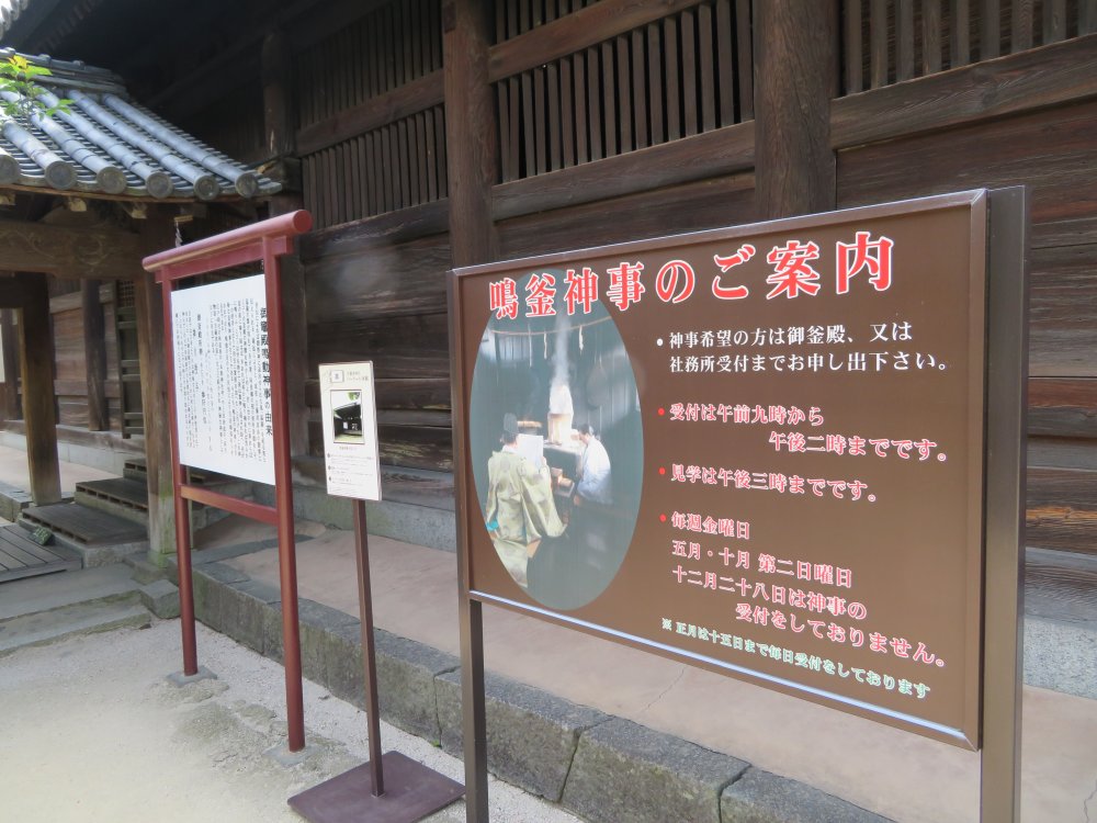 We swerved to the right close to the end of the corridor to visit the Okama-den. This is a famous place where a ritual is performed to tell whether a wish can be granted. The description beside the building tells us of the origin of the ritual. The demon Ura that was slain by the shrine’s deity Ookibitsuhikonomikoto appeared in a dream and said “Cook offering rice in the pot (kama). If there will be good fortune, the pot will make a gentle noise, and in case of misfortune an angry noise.” You can pay 1,000 yen to be told whether your wish will be granted or not.