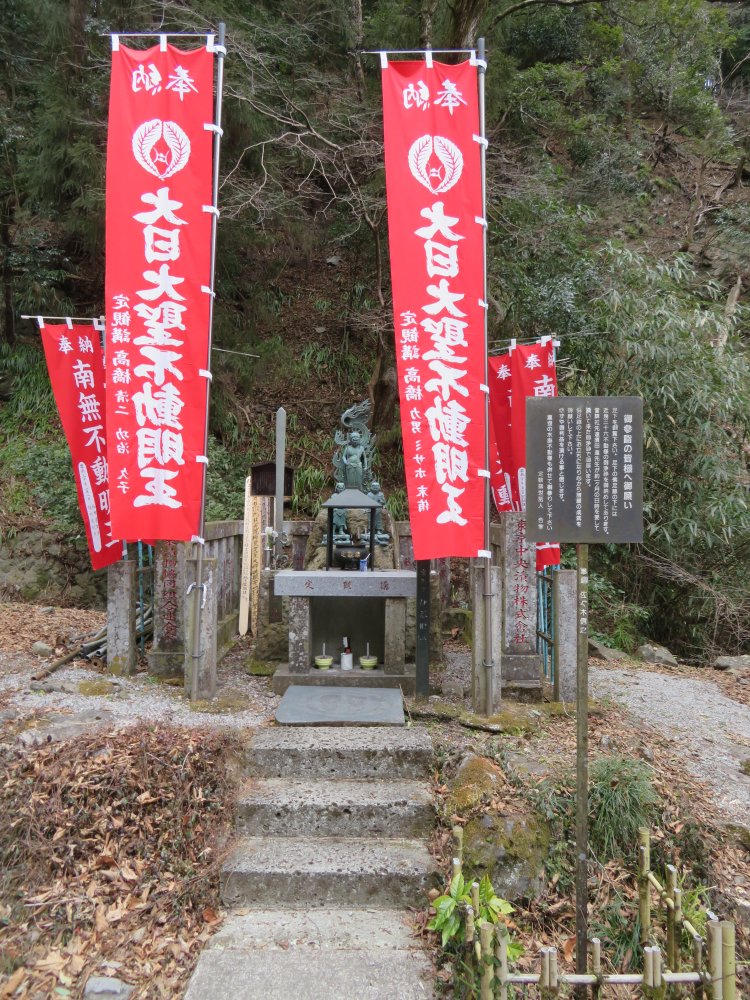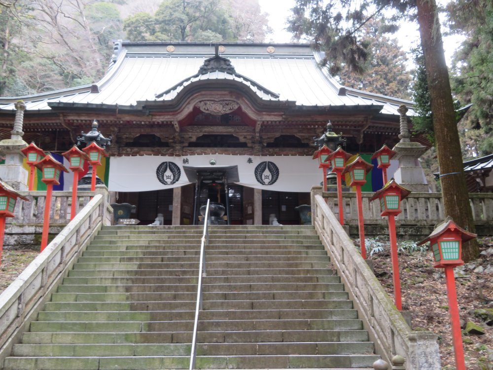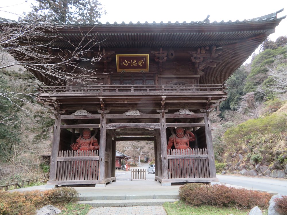 We first visited Izurusan Manganji Temple, approximately twenty kilometers northwest of Tochigi City. This is a Buddhist temple of the Shingon sect founded in 765AD according to the temple’s homepage. On our way to the temple we passed many limestone quarries. I am told that the temple was founded in this area as a stalactite resembling a multi-faced Kannon bosatsu was found in a limestone cavern. (Kannon bosatsu is a particularly benevolent bosatsu that takes thirty three different appearances depending on the person it is helping. Some Kannonbosatsus have many hands and an eye on each palm. These are called Senju (meaning one thousand hands) Kannon bosatsu. For more on Kannnon bosatsu see the article in Travel (Aizu Part 2)). This Kannon bosatsu is housed in a temple called Okunoin which is about one kilometer climb from the main temple. Our visit to Manganji turned out to be much more interesting than we had expected..