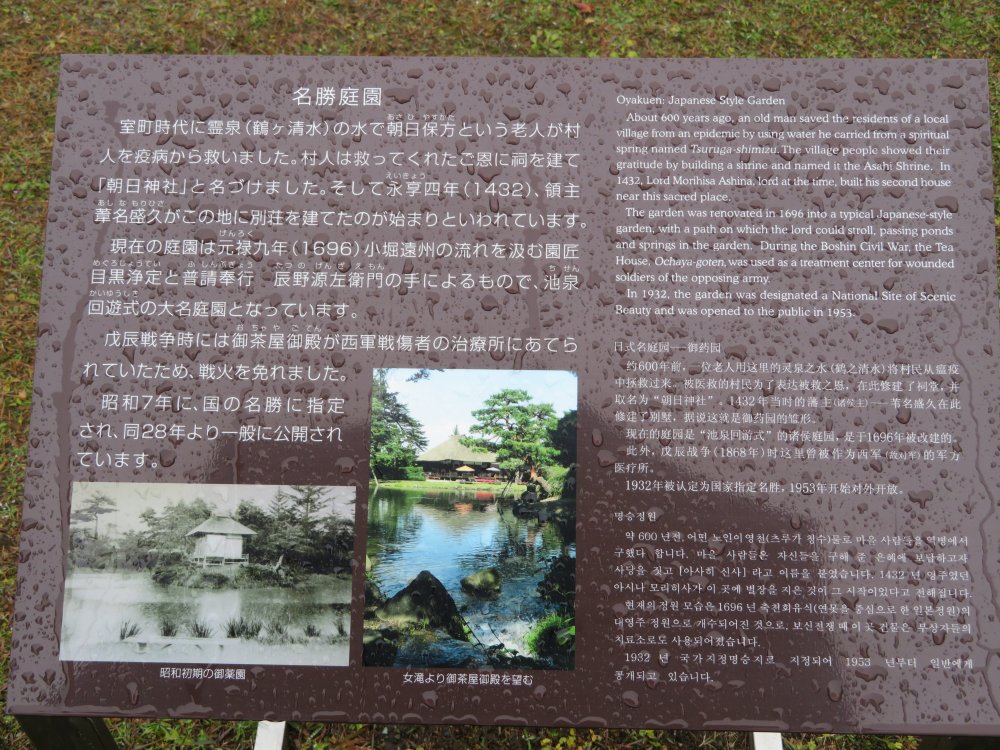 A signboard in front of the garden tells you the history of Oyakuen.