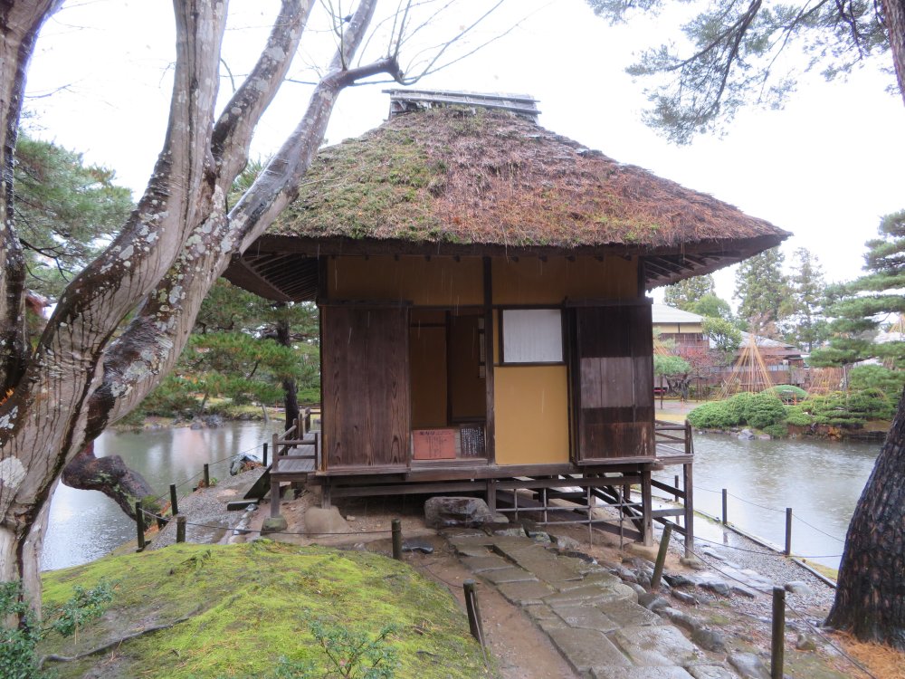 View of the tea ceremony room jutting out to the middle of the pond.