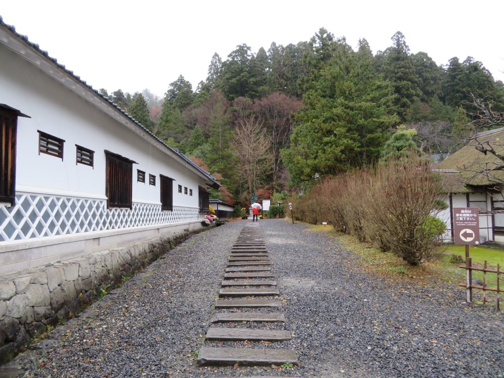 Although it was past the opening hour the premises seemed closed. We rang the calling bell at the admission office which was part of an adjacent private house. Shortly an elderly lady came to the door. “Oh I’m so sorry. I didn’t think we would have any visitors in this snow“. She then opened up the honjin building, invited us in and showed us around. She told us quite a lot. We learned that there was a special entrance gate for the feudal lord from where he would proceed to the designated guest room. We were shown the bullet holes and sword cuts to the pillars when the honjin was attacked by the anti-shogunate army.