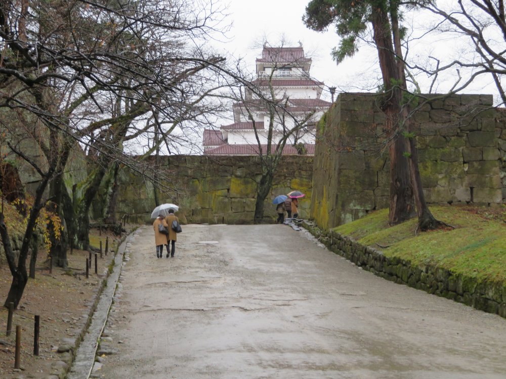 It was past two by the time we got to Tsuruga Castle. The distance from the car park to the castle area wasn’t that long. It appears a castle stood at this site from the fourteenth century, but it was only in the late sixteenth century that it was modernly expanded by Ujisato Gamou. The castle was severely damaged after the Aizu War in 1868 and was subsequently demolished. What remains today is the bare ground of the former site of the main castle building and the keep reconstructed in 1965 using reinforced concrete. We noticed a signpost showing next guided tour from two thirty. I went to the information office to tell them we wished to join the tour. “Oh you don’t have to wait. Let me call the voluntary guide now.” Momentarily a lady volunteer guide appeared and suggested we start immediately. When we asked if we shouldn’t wait till two thirty, she told us not to worry and changed the signpost to show next guided tour two fifty. “I’ve already informed the other guide” she said. She showed us some interesting places in the castle grounds. One was the approach to the main castle site. Although this has now been paved, she took us aside to show the original approach. “Notice that the space between each step is not the same. The reason is to stall the approaching enemy by causing them to trip against each other”. She took us to the bottom of the keep and drew our attention to the stone mound. “This is in contrast to the stone walls which use much larger and heavier rocks”. The stones used in the stone mound were much smaller and appeared to be put on top of each other randomly. “There were some cracks and other damage to the stone wall caused by the earthquake but none at the castle mound.” She next pointed up to the bottom of the keep. “Notice that the keep is contained within the mound, when usually keeps are constructed to stick out of the mound so that the enemy climbing up the mound could be attacked from the keep above. That’s because originally a seven story keep was built until replaced by a five story keep as it was considered to be offensive to the Tokugawa shougun who resided in Edo Castle with a five story keep”.