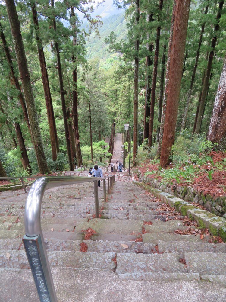 Minobusan is known as a sacred place of the Nichiren Buddhist sect where their head temple Kuonji is situated. Nichiren was born in Amatsu-kominato at the southern tip of the Boso Peninsula (Chiba Prefecture). He was convinced that the only way for mankind to achieve peace was to follow the teachings of the Lotus Sutra (Hokkekyou) and started preaching in Kamakura, the then military capital of Japan in the middle of the 13th century. He called for the abandonment of the teachings of the Joudo sect as well as the zen sects for which he was persecuted by the Joudo sect as well as the zen sects revered by the Kamakura military government. He was exiled to Sado Island and on his return invited to Minobusan to teach and pray for peace in 1274, just before the first Mongolian invasion. Kuonji was founded in 1281 at a site to the west and lower level of the present temple grounds relocated in the 15th century. We parked at the car park beside the temple grounds. And entered the main temple grounds. We first took a peek of the steep 287 stairs from the Sanmon gate at the lower level which was the proper route to the temple ground level.
