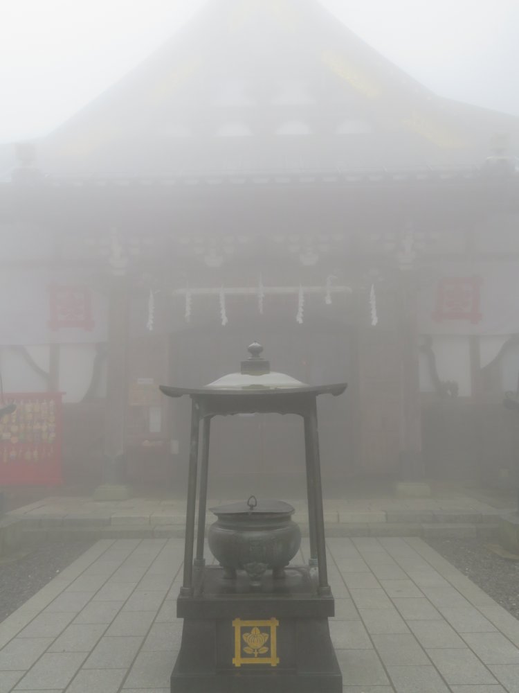 From the temple grounds it is a short walk to the bottom station of the ropeway. The ropeway climbs 763 meters in seven minutes to the mountain top at an altitude of 1,153 meters. It had started to rain at the main temple level and as we went up, we entered a thick mist and visibility dropped to almost zero. We had taken the ropeway to visit Shishinkaku. This is also a temple dedicated to Nichiren on top of the mountain where he climbed, looked towards the Boso Peninsula where he was born and mourned for his deceased parents. We barely managed to make out the building. The round trip for the ropeway is 1,400 yen, but we subsequently learned you can get a discount if you book on the internet.