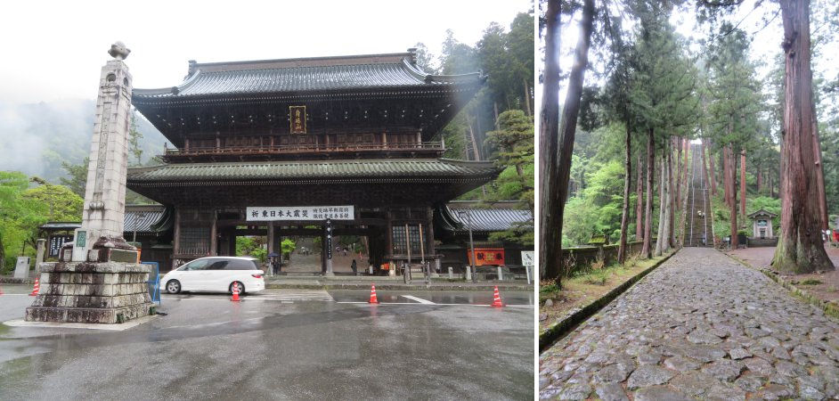 The grand Sanmon gate rebuilt in 1907 (left) and the 287 steps leading up to the temple grounds (right).