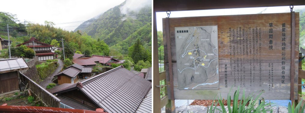 View of the mountain lodging village of Akazawa and the description of Important Preservation District for Groups of Historic Buildings.
