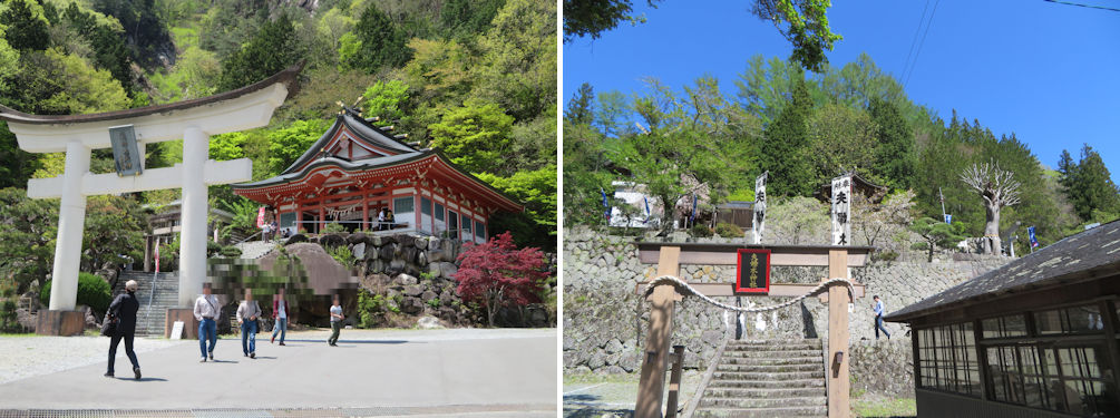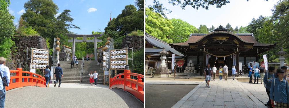 Entrance gate (left) and the main shrine (Honden) area. It was in the middle of a ten-day long Golden Week, and there were quite a few visitors.